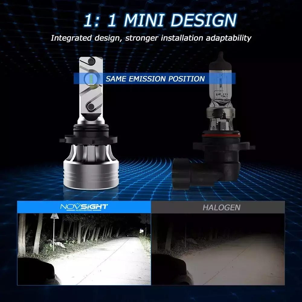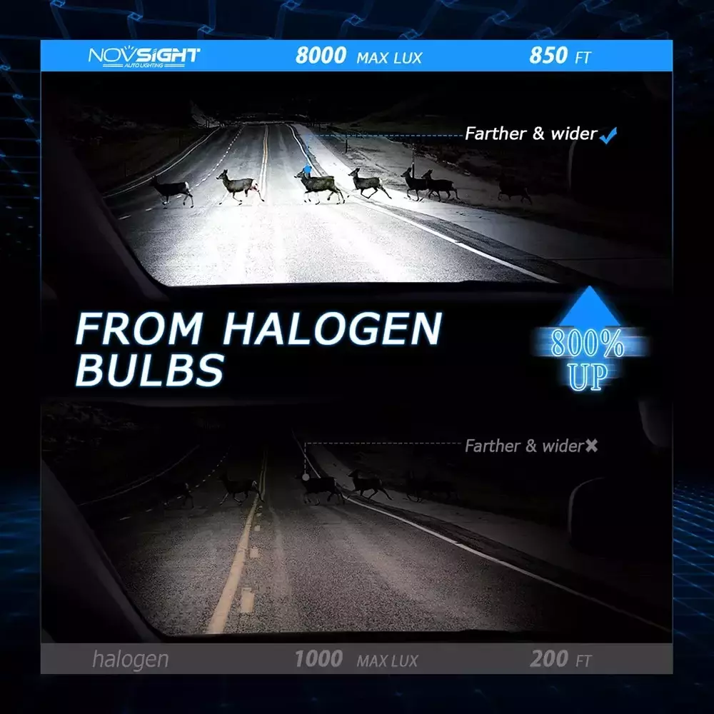 Використовуючи останні технології Novsight «G-XP» кожна, лампа випромінює 9000 Люмен яскраво білого світла температурою 6500 К. Використовуючи таку ж довжину світлових елементів, як і в галогенових лампах за того ж фокусування ви отримуєте велику яскравість і освітленість. Чіткий промінь світла, без відблисків і темних плям набагато безпечніше.